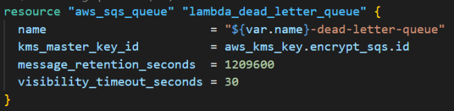 The AWS Lambda function consumes the Docker container image stored in Amazon ECR through the image_uri parameter. It also requires the IAM role that we created previously. This IAM role provides limited access to the AWS Lambda function, allowing it to perform specific operations, including pulling images from ECR and sending messages to the dead letter queue. The package_type is set to “Image”, which indicates this is a containerized Lambda function rather than a traditional zip-based deployment. The AWS KMS key is required to encrypt the environment variables used in the function. The logging_config stores the log_group information to store the execution logs, along with the log_format set to “JSON” and system_log_level set to “INFO” for structured logging. The dead_letter_config specifies the SQS queue where failed invocation events are sent for error handling and debugging purposes. Finally, the environment variables section passes the variables shared with the function, though in this case, it’s empty as configuration is handled within the container image.