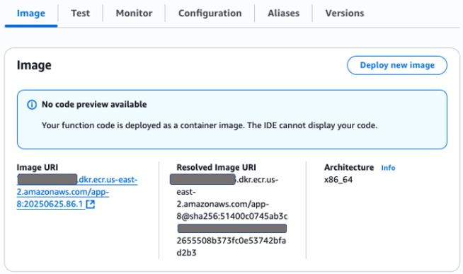 – the image tag from the second job is referenced in the third to deploy the exact version to Lambda.
