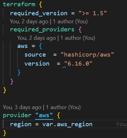 In the feature branch, create a provider.tf file with the Terraform configuration. Set the minimum version to 1.5+ (required for import blocks) and pin the AWS provider version for stability.