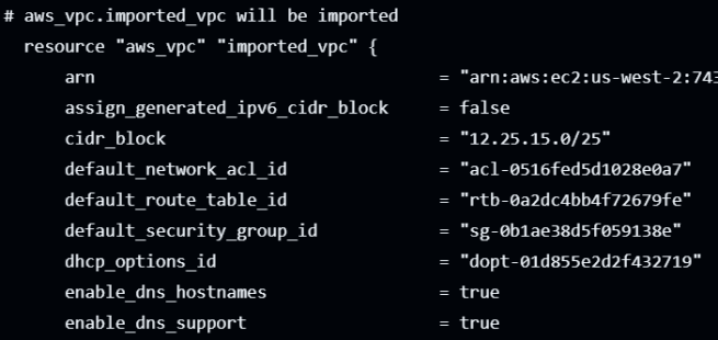 The image below shows that the aws_vpc.imported_vpc will be imported into the state file without any changes (~).