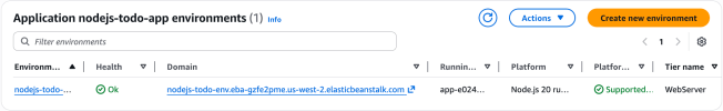 After successful deployment, the AWS Elastic Beanstalk console displays the environment status and health information. The environment shows as “Ok” with a green health indicator when all components are functioning correctly.