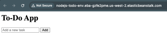 The deployed application becomes accessible through the automatically generated Elastic Beanstalk URL. The to-do application loads successfully, indicating that all infrastructure components are functioning as expected.