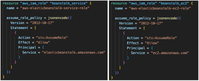 Elastic Beanstalk requires two distinct IAM roles with specific permissions. The terraform/iam.tf file creates these roles: (i) beanstalk_service, and (ii) beanstalk_ec2.
