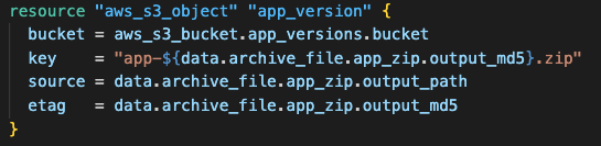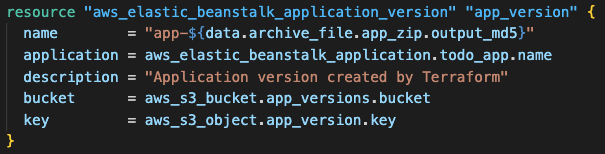 Finally, it also uploads the zip file to the S3 bucket for the Elastic Beanstalk application to consume. The etag property uses the MD5 hash of the zip file to ensure Terraform uploads the object only when the application code changes, enabling efficient change detection and avoiding unnecessary uploads.