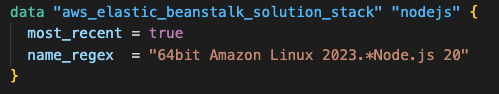 Solution Stack Data Source: The aws_elastic_beanstalk_solution_stack data source dynamically retrieves the latest Node.js 20 platform running on Amazon Linux 2023.