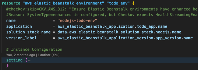 The core Elastic Beanstalk configuration brings together all previous components. The terraform/beanstalk.tf file defines the solution stack, the application, version, and the environment to host the Beanstalk application.